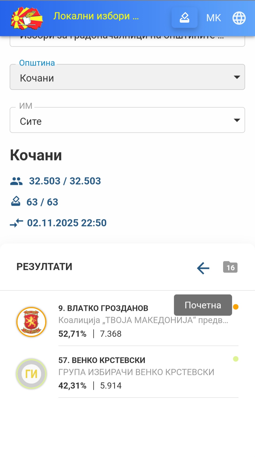 Конечни резултати – Кочани Life News November 2, 2025November 2, 2025adminLeave a Comment on Конечни резултати – Кочани Овие се конечните резултати за Општина Кочани Share this: Click to share on Facebook (Opens in new window) Facebook Click to share on X (Opens in new window) X Related